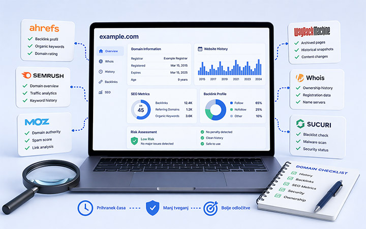 Pri izbiri domene ne gledamo le na ime, temveč tudi na njeno preteklost. Domena je lahko že obstajala, imela svojo vsebino, obiskovalce ali celo težave z ugledom. Takšne informacije vplivajo na prihodnji razvoj spletne strani, vidnost v iskalnikih ter zaupanje uporabnikov.